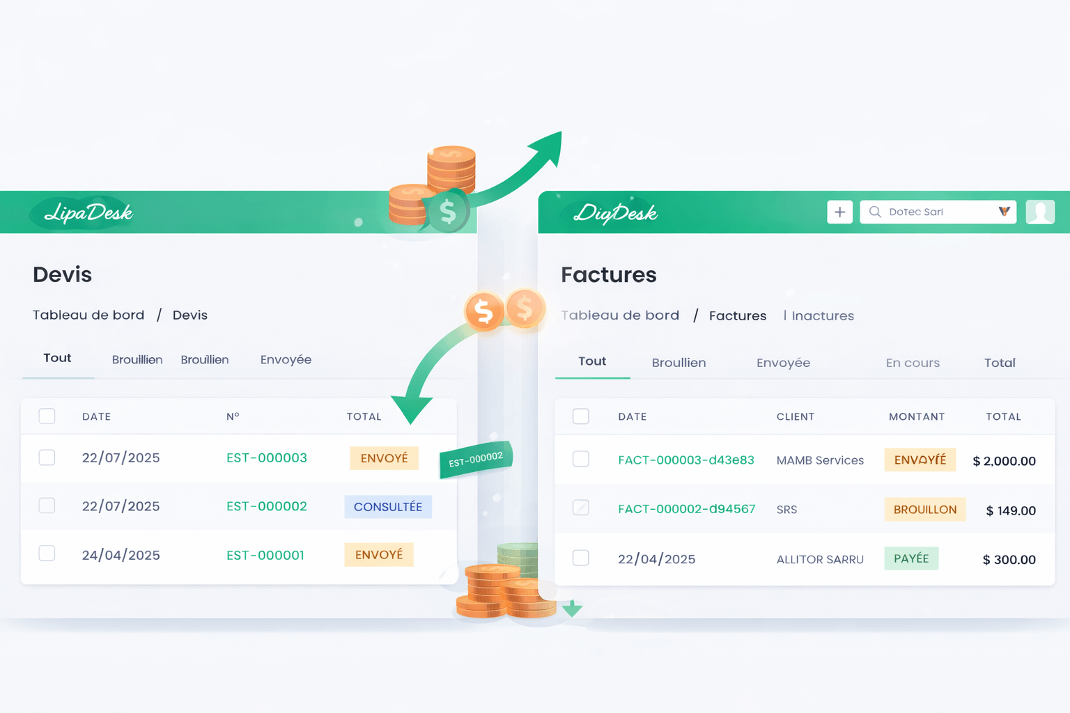 Lipadesk rassemble toutes les fonctionnalités essentielles pour piloter votre activité, de l’émission du premier devis au suivi de votre croissance.